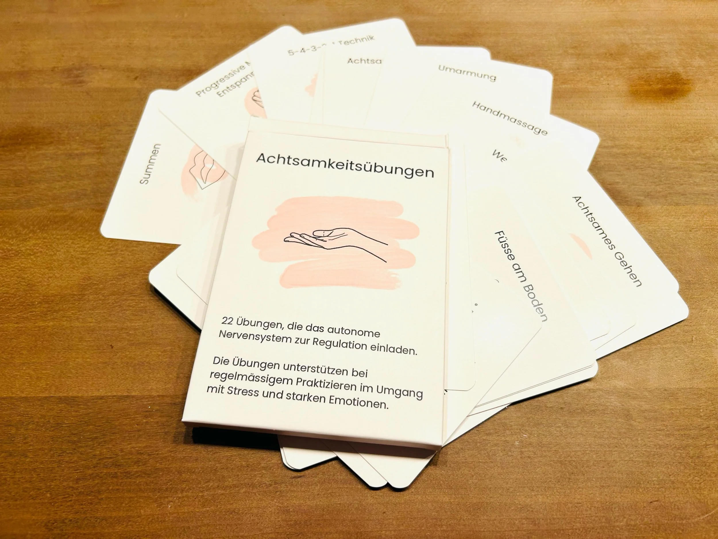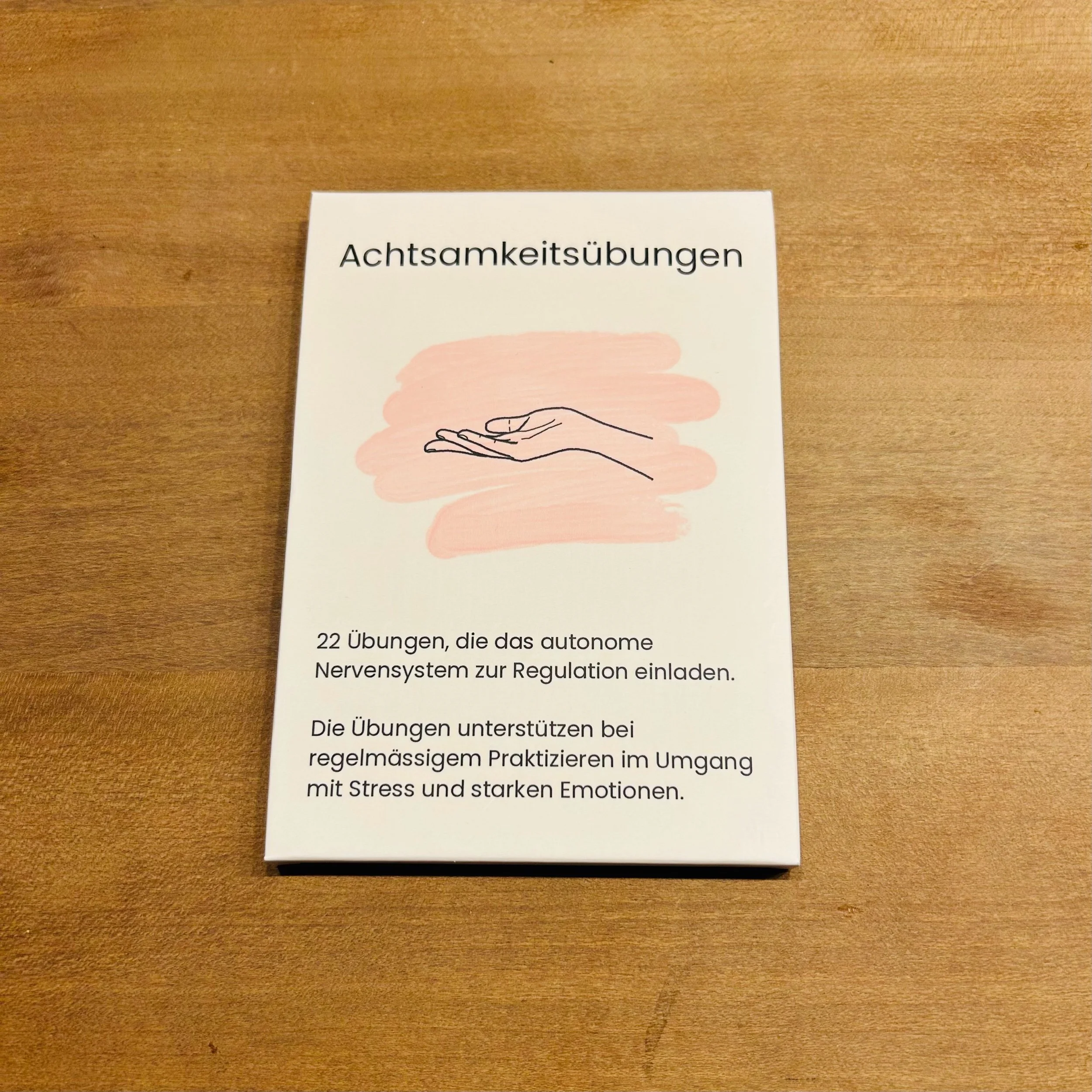 Achtsamkeit kann unser autonomes Nervensystem unterstützen, sich zu regulieren. In meiner Praxis haben sich einige Übungen besonders bewährt. Diese Übungen sind nun in einem handlichen Kartenset zusammengefasst. Das Kartenset enthält 22 Karten auf denen einfache Achtsamkeitsübungen beschrieben sind, die von jedem Menschen praktiziert werden können. Jede Übung ist klar und verständlich erklärt, sodass sie sich leicht in den Alltag integrieren lässt.